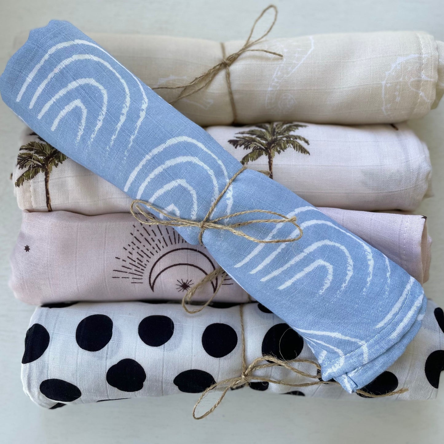 Wriggle Crew muslin swaddles are made from a beautifully soft blend of cotton and bamboo.